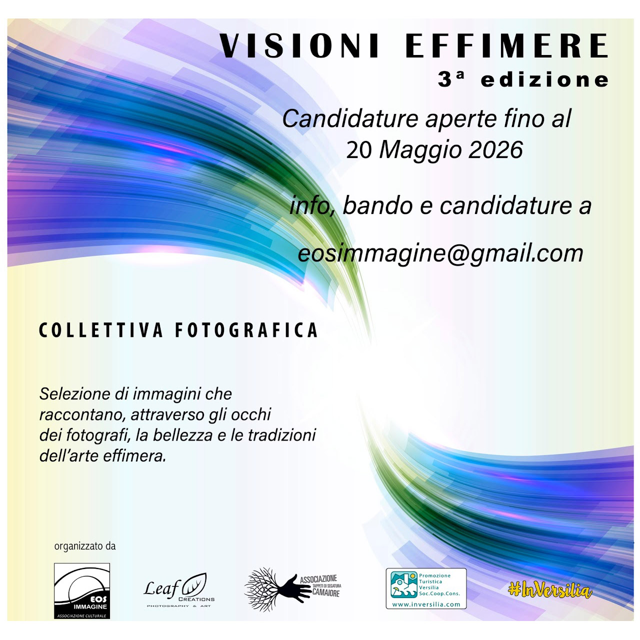 Il Concorso fotografico “Visioni Effimere 2026” è promosso da Associazione Culturale Eos Immagine, in collaborazione con Associazione Tappeti di Segatura Camaiore, con il supporto del Consorzio di Promozione Turistica della Versilia e Leaf Creations.